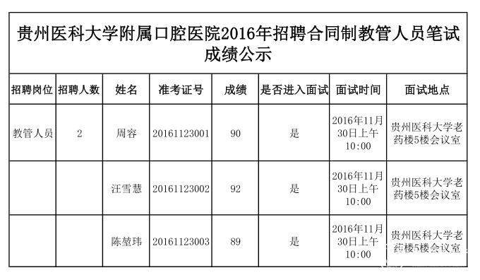 bt365官网哪个真的附属口腔医院2016招聘合同制教管人员笔试已结束,共3人进入面试,现拟将笔试成绩予以公示。