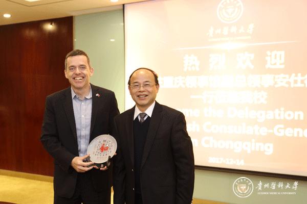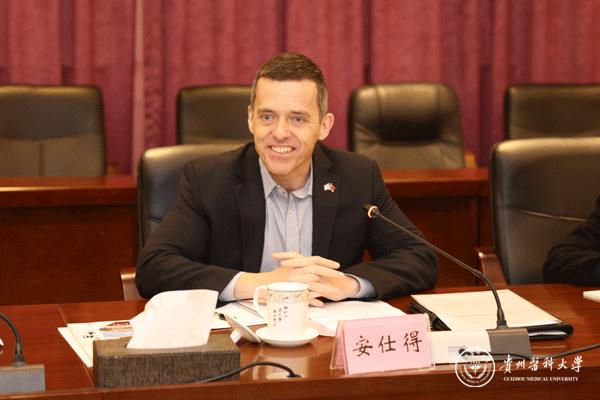 12月14日,英国驻重庆领事馆副总领事安仕得先生(Mr. Stephen Agnew)一行来校交流访问,贵州省外事办欧美工作处陈沛欣陪同。座谈会在南校区知雨楼六楼会议室举行,校长何志旭,校长办公室、国际交流合作处、基础医学院、生物与工程学院、麻醉学院、实验动物中心和民族药与中药开发应用教育部工程研究中心等相关部门负责人参加。会议由国际交流合作处处长付启宏主持。