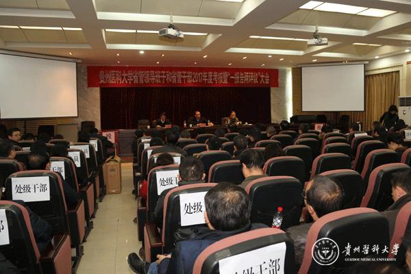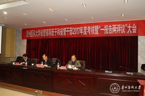 根据省委组织部《关于开展 2017 年省管领导班子和省管干部年度考核工作的通知》精神,1月11日,学校省管领导班子和省管干部2017年度考核暨“一报告两评议”大会在北校区基础二号楼道德讲堂举行。校党委书记林昌虎代表学校领导班子作述职述廉报告,校党委副书记吕保平作2017年度关于干部选拔任用工作情况报告。大会由校党委副书记、校长何志旭主持,省委组织部考核组成员黄智泯、付燕、郑龙超、徐殿鹏到会指导。校领导刘兴德,罗俊,孙诚谊,刘健,罗鹏,战勇,黄亚励,冉江舟等,学校职能部门处级干部,教学教辅单位主要负责同志(含主持工作副职),三所附属医院正处级领导干部(含主持工作副职)、天产室处级以上干部参加会议。