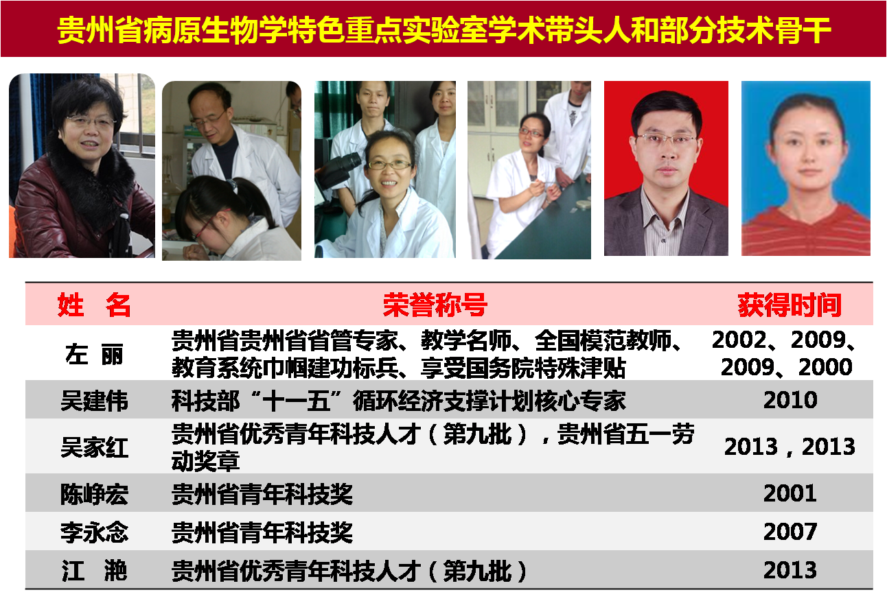 本实验室现有专业人员28名,其中教授9名,副教授12名,讲师7名;有博士后经历1人,在站博士后1人,获博士学位15人,获硕士学位12人;有博士生导师2人,硕士生导师13人;12人有国外研修经历。教师中多人次获国家级、省级的荣誉称号,并且引进了第二军医大学廖万清院士、北京大学医学部免疫系主任、长江学者特聘教授张毓教授以及美国Temple大学Mark Feitelson教授为候鸟型人才或客座教授指导科研工作,是病原生物学、免疫学及其相关学科人才培养的基地,学生多人次获贵州省首期“硕博论坛”学术论文(农医类)一等奖、二等奖等奖励。