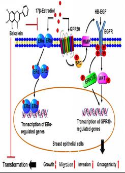 乳腺癌作为一种激素依赖性肿瘤产生于乳腺上皮。乳腺上皮细胞长期接受雌激素刺激会发生恶性转化,进而促进乳腺癌的形成和发展。乳腺癌的化学预防成为当前研究的热点。前期流行病学研究表明,黄酮类化合物的摄入能够降低乳腺癌发生的风险,但原因尚不明确。中药黄芩具有清热燥湿,泻火解毒,止血,安胎之功效,作为黄酮类化合物的黄芩素是其主要药效物质。