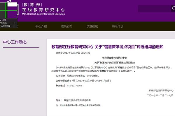 12月27日,教育部在线教育研究中心 下发《关于“智慧教学试点项目”评选结果的通知》,我校被评为“智慧教学试点项目”单位。
