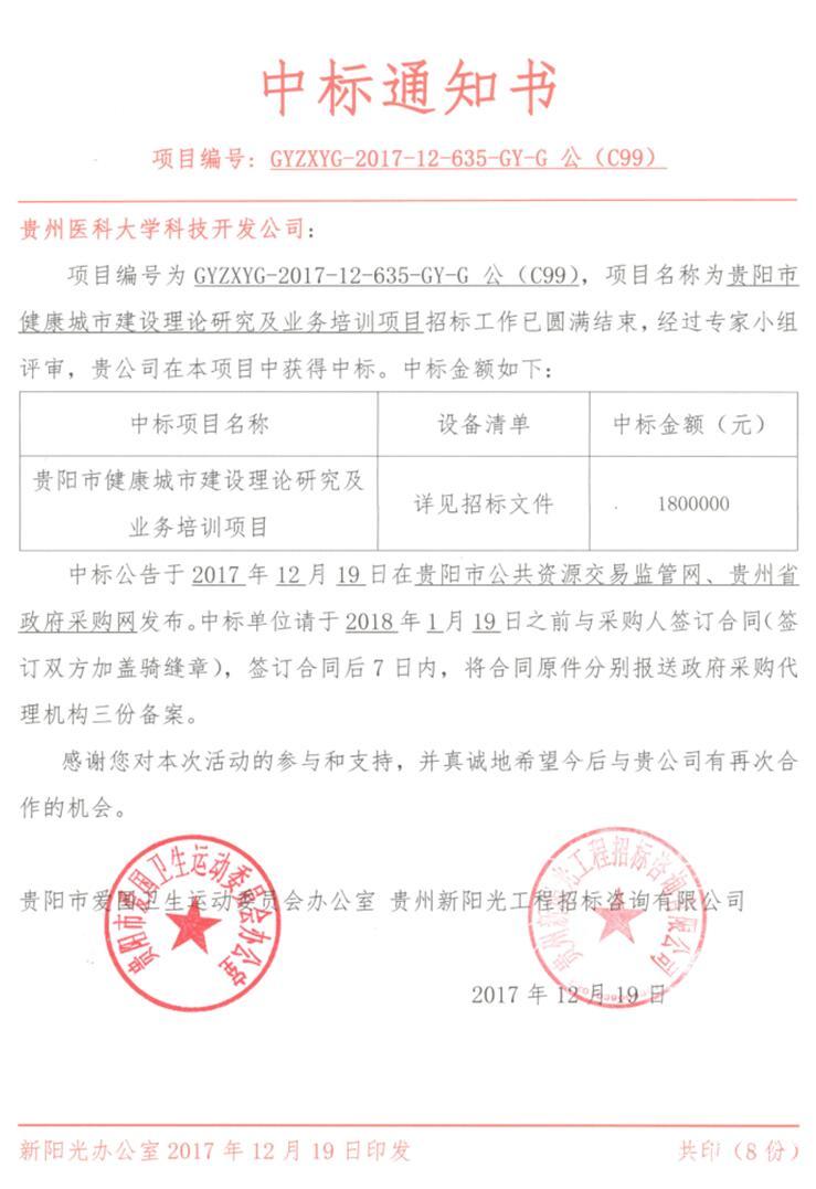 为科学有序地推进贵阳健康城市建设工作,贵阳市政府设立贵阳市健康城市建设项目,并举行公开招标。我校贵州省卫生发展研究院经过前期充分调研准备,2017年12月19日,在第三方组织的公开竞标中脱颖而出,获项目经费180万元。2018年元月,在贵阳市爱卫会的指导下正式实施。该项目实施周期一年,其中包含编制建设规划、理论研究30个子项目,规模性理论培训12次,实践指导50家健康细胞建设单位,研究成果汇编成册并公开发行用于实践指导等。