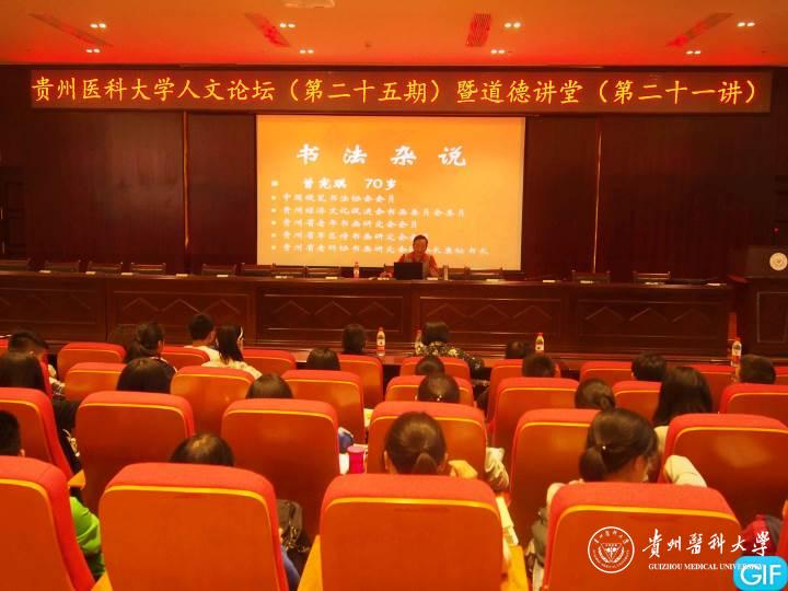 10月15日下午,我校人文论坛第二十五期暨道德讲堂第二十一讲——《书法杂说》专题讲座在南校区道德讲堂举行。本次论坛邀请到中国硬笔书法协会会员、贵州经济文化促进会书画委员会委员、贵州老年书画研究会会员、贵州省军区诗书画研究会会员、贵州省老科协书画研究会副会长兼秘书长曾宪琪主讲。各院(系)学生代表400余人参加了本次活动。