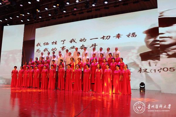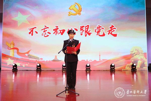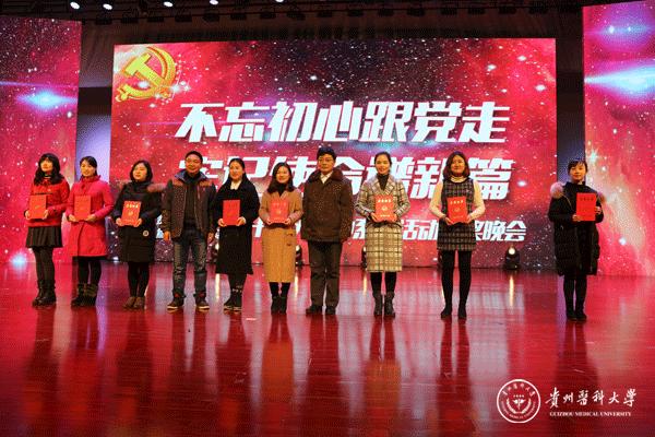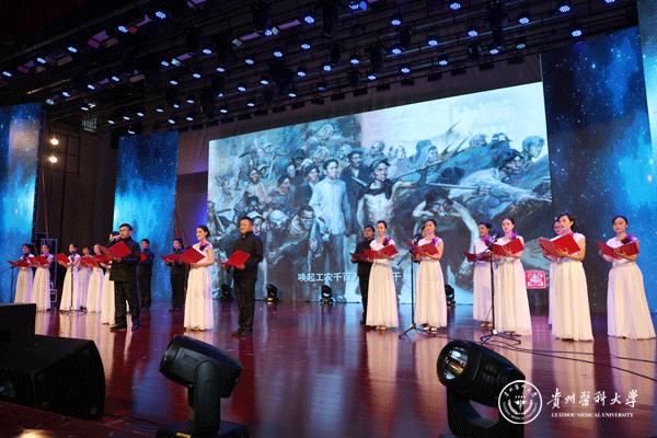 晚会以舞蹈《追寻》拉开帷幕,诗朗诵《我心飞翔,献给您的颂歌》、独唱《天耀中华》、舞蹈《欢歌共舞》等展现了青年一代“贵医人”团结向上、拼搏奋进的精神风貌,合唱《心里装着谁》、《没有共产党就没有新中国》演绎了老一辈“贵医人”热爱生活、忠诚选择的可贵品质。此外,在《微宣讲》活动环节,党的十九大代表、我校优秀校友赵晶晶用切身体会生动讲述了一名基层党员民警代表执着信仰、坚守岗位、无私奉献的心路历程;在访谈活动环节,三位优秀的教师代表——秉承让科研服务临床理念的外科医生孙发老师、药学科研工作者汤磊老师、抗癌一线的医务工作者苏胜发老师分别讲述了各自的亲身经历,用朴实的语言、动人的故事、浓烈的激情向在座的老师和同学们传递了献身医药卫生管理事业、执着科研创新、勇攀科学高峰的医学正能量。