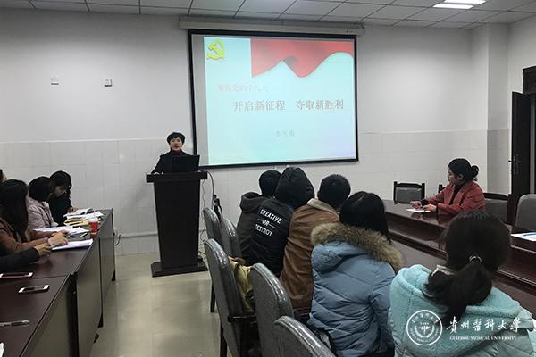 会上,党委书记李雪梅首先以《聚焦党的十九大——开启新征程 夺取新胜利》为题,带领大家深刻学习领会十九大报告中的四个“新”,即中国特色社会主义进入新时代的新论断、我国社会主要矛盾发生的新特点、分两步走全面建设社会主义现代化国家的新目标、党的建设的新要求,并详细介绍了“团结奋进、拼搏创新、苦干实干、后发赶超”的新时代贵州精神,要求每一位党员站在新时代的路口查找不足,补齐短板,奋勇向前。